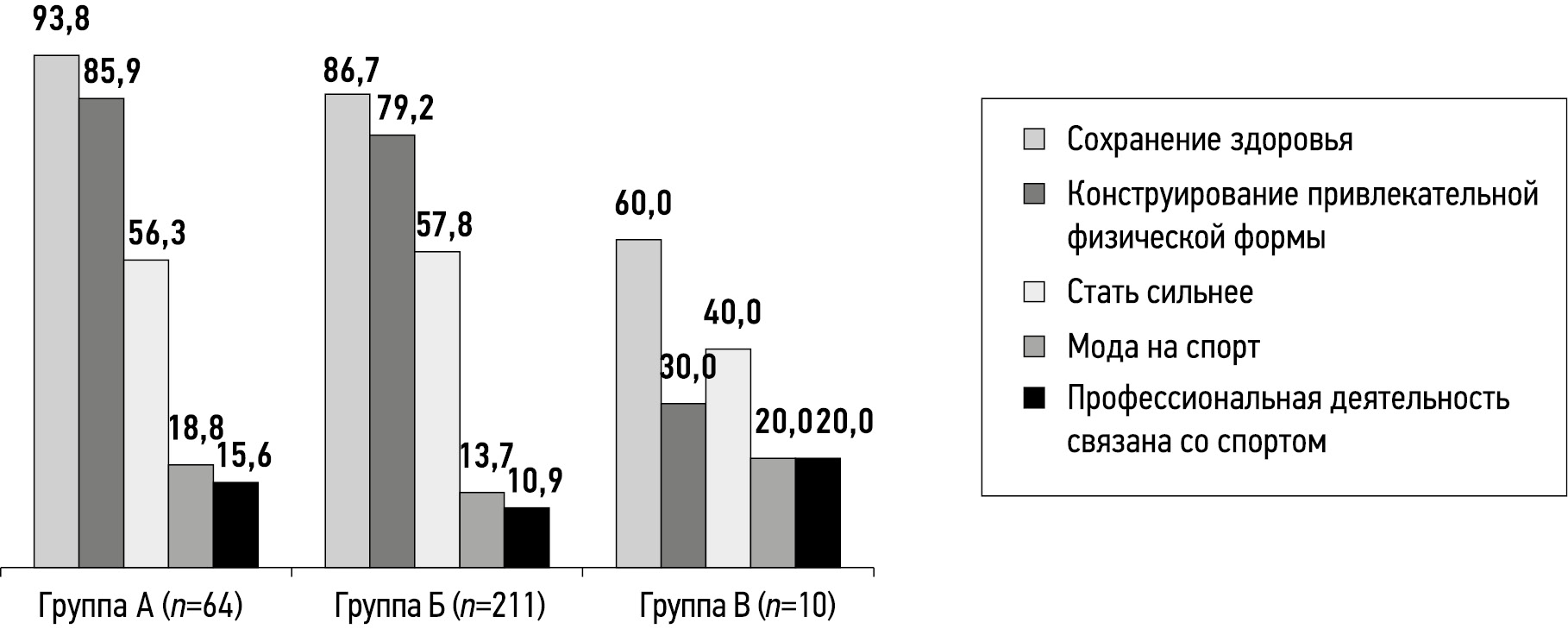 Побудительными мотивами к занятию спортом могут оказаться не только внутренние стимулы к укреплению и сохранению здоровья, но и социальные стереотипы (мода на спорт, популяризация успешности внешне привлекательных людей, паттерны поведения и др.). Для всех 3 групп структура мотивации к занятию спортом практически идентична, но существенно отличается фактор физической привлекательности, который имеет значительно меньший вес у респондентов группы В. Это может указывать на перевзвешивание ценности внешней привлекательности и физической формы у москвичей, не приверженных ЗОЖ, однако данное заключение требует проверки в последующем исследовании (рис. 2).