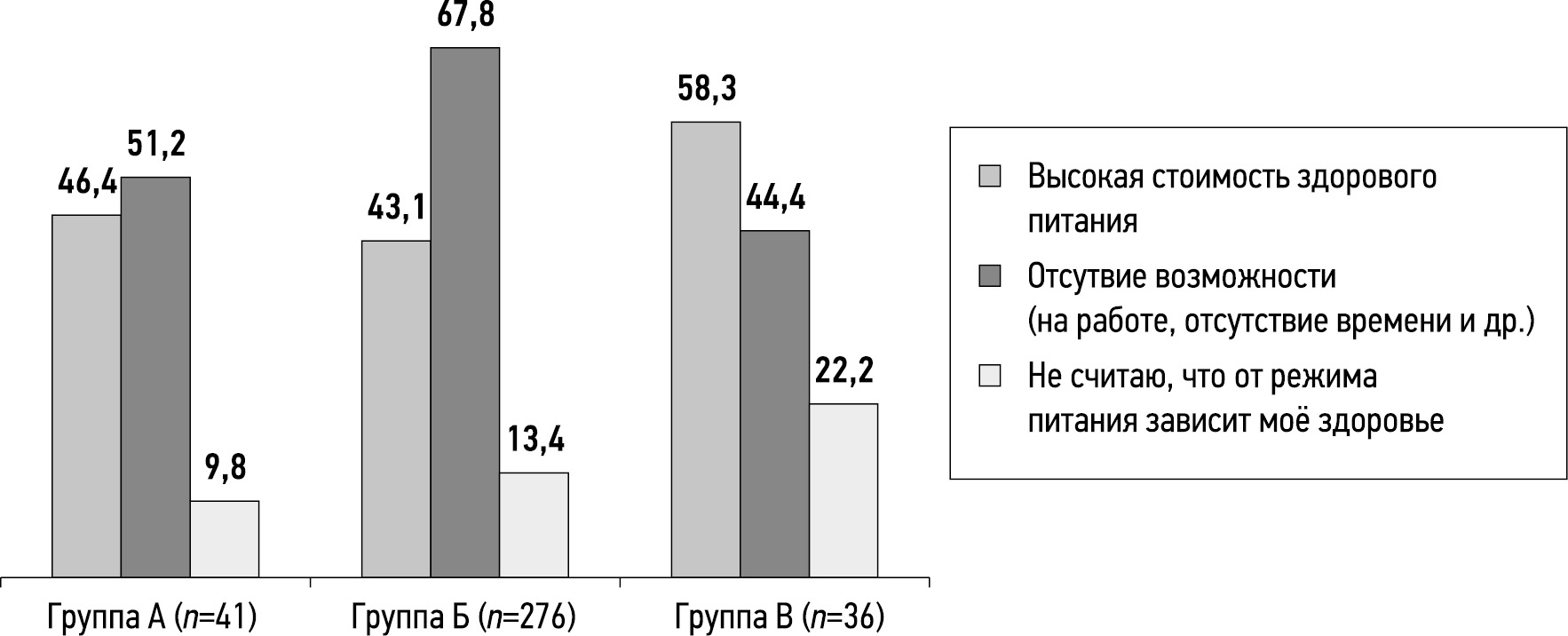 Сбалансированное и правильное питание во многом служит залогом укрепления и поддержания здоровья [9, 10]. Большинство опрошенных (75,3±2,0%) стараются соблюдать здоровый режим питания. Показательно, что большинство респондентов в группе А (85,6±5,5%) и группе Б (75,2±2,6%) соблюдают режим питания, тогда как только 1/3 (35,0±7,9%) москвичей группы В стараются придерживаться указанного режима. Основные факторы, препятствующие соблюдению здорового режима питания, идентичны у представителей группы А и группы Б, что во многом обусловлено высокими нагрузками. При этом ключевым аргументом несоблюдения режима питания у респондентов группы В является высокая стоимость здорового питания (рис. 4). Интересно, что 1/10 (9,8%) москвичей группы А не связывают режим питания и состояние своего здоровья, что указывает на очевидный пробел в знаниях о роли ЗОЖ для сохранения здоровья человека.