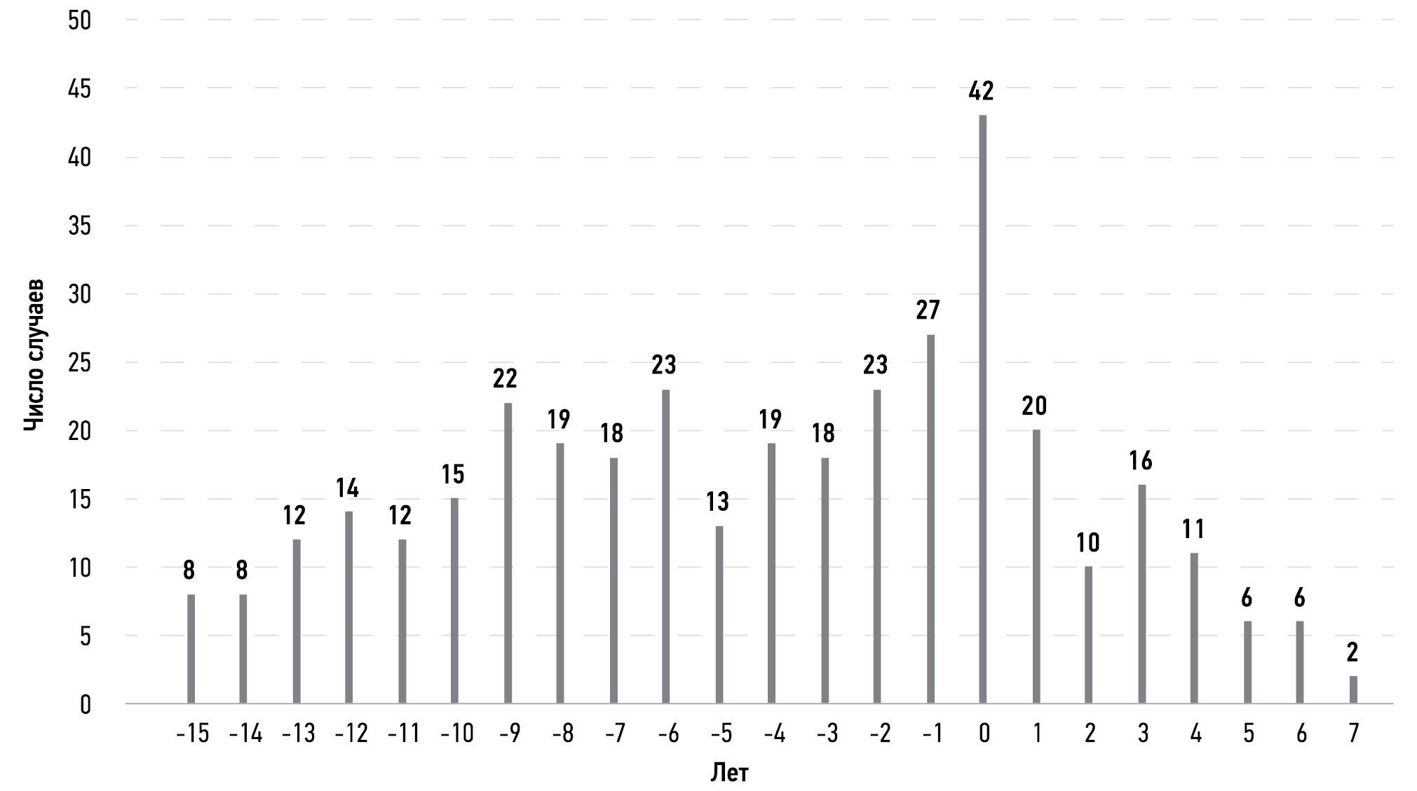 Примечание. Цена деления на оси Х равна 1 году, отрицательные значения соответствуют периоду до постановки диагноза ребёнку; 0 — год постановки диагноза; положительные значения по оси Х — период после постановки диагноза. Медиана составила -4 года, среднее число лет между прекращением брака и началом заболевания —-4,0 года [мода — 0 лет (n=42)]. Стандартное отклонение для показателя «число завершённых браков» равно 8,54, коэффициент вариации — 5,946.