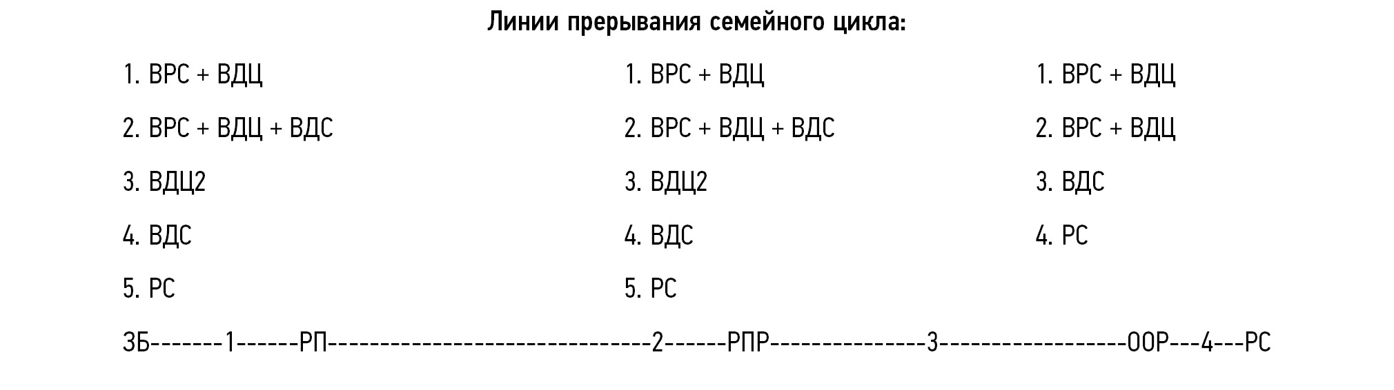 Примечание. РП — рождение первенца, РПР — рождение последнего ребёнка, ООР — отделение первого ребёнка от родителей, РС — распад семьи (развод, смерть одного из супругов), ВДЦ — вынужденная депривация одного из родителей от ребёнка, ВДЦ2 — вынужденная депривация обоих родителей от ребёнка, ВРС — вынужденное разделение супругов, ВДС — вынужденная депривация сиблингов друг от друга, ЗБ — заключение брака.