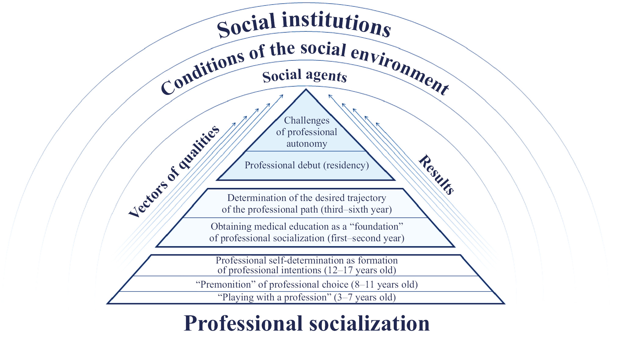 The present study, based on narrative interviews, revealed a wide range of meaningful and content-related patterns that help explain not only motivations for choosing a medical career, but also the socialization trajectories of physicians across a broad temporal and developmental spectrum. The findings also allowed us to describe the role of key social agents at each stage—“career guides.” Our analysis identified major narrative strategies, plots, characters, and temporal markers. Using an inductive narrative approach [32], we organized the data, extracted discursive trajectories, identified stable social practices [33, 34], and outlined three core semantic data blocks (including seven subgroups), which acted as the empirical basis for the standard plot of narratives: “playing doctor” (ages 3–7), "premonition" of professional choice (ages 8–11), professional self-determination or formation of career intentions (ages 12–17), medical education as the "foundation" of professional socialization (years 1–2), choosing a career trajectory (years 3–6), debut of professional activity (residency), and “challenges of professional autonomy.” This analysis identified key factors and conditions that shape the process and trajectory of physicians' professional socialization, as well as reference points and developmental vectors for essential professional qualities. These findings served as the foundation for constructing a model of physicians’ professional socialization (Fig. 1).