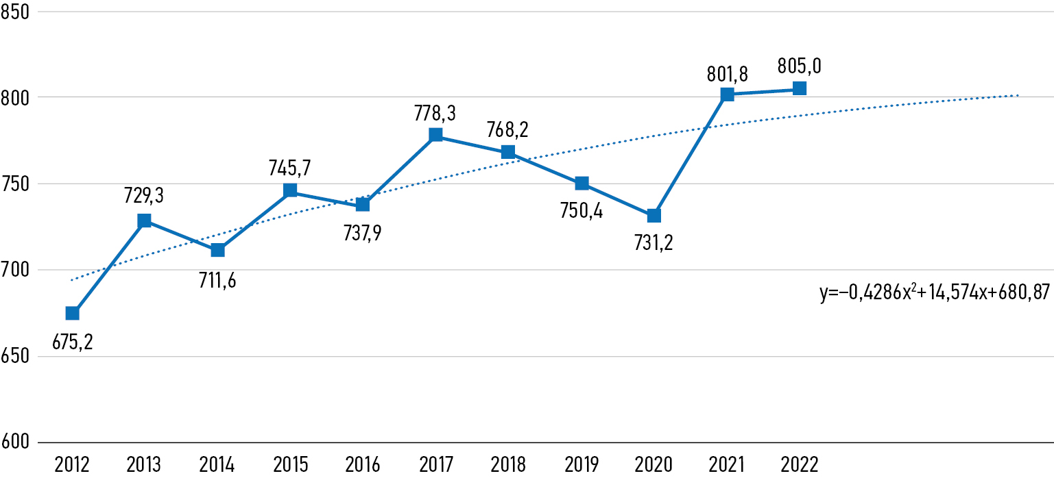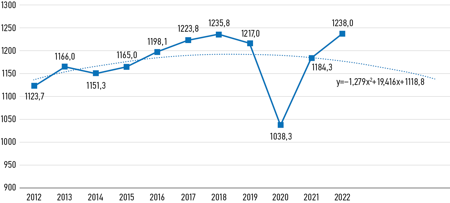 Fig. 1. Number of cases of respiratory diseases among children aged 0–14 years in the Novosibirsk Region from 2012 to 2022 according to Federal State Statistics Service of the Russian Federation (total incidence per 1000 children of the corresponding age).