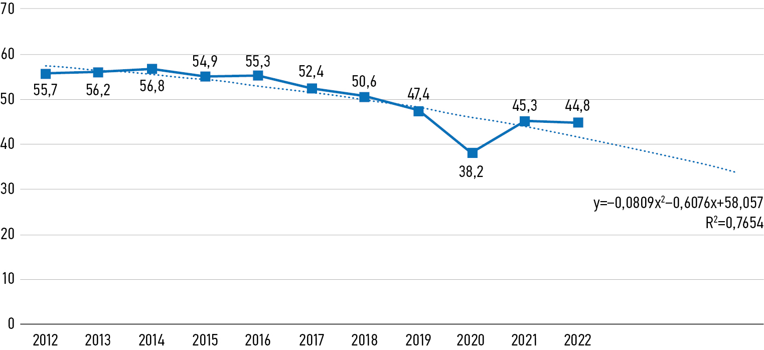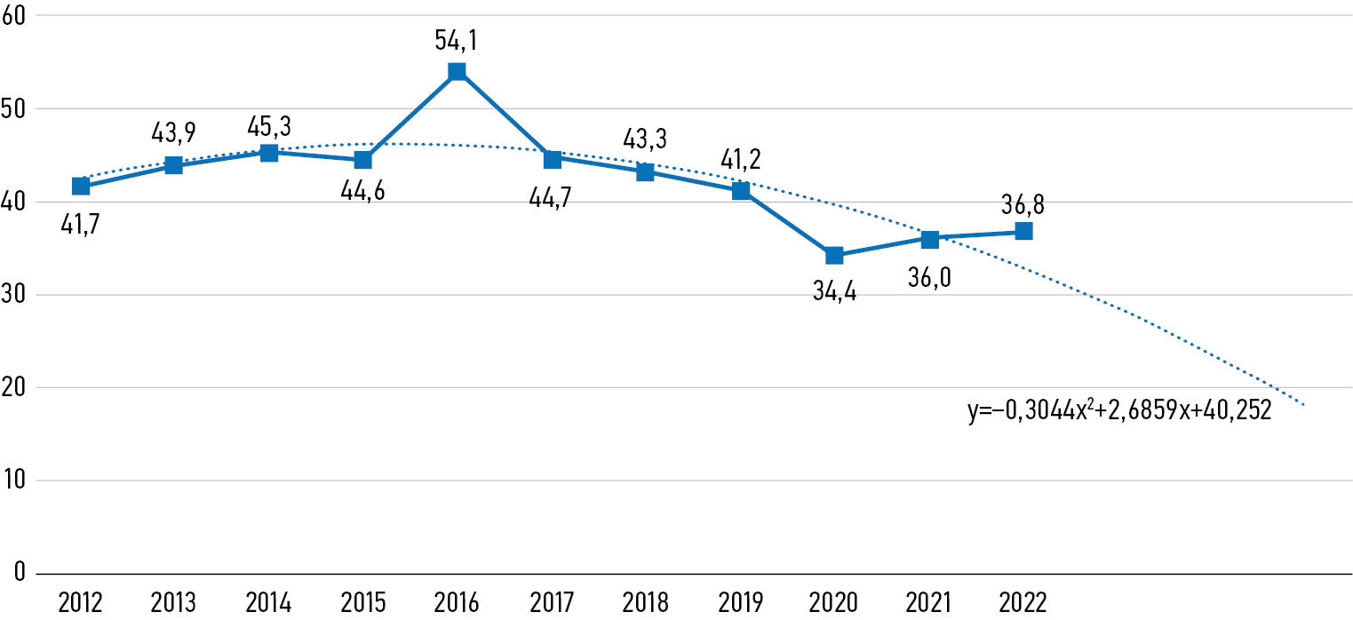 Fig. 6. Number of children aged 0–17 years with chronic diseases of the tonsils and adenoids in the Novosibirsk Region from 2012 to 2022 according to Federal State Statistics Service of the Russian Federation (total incidence per 1000 children of the corresponding age).