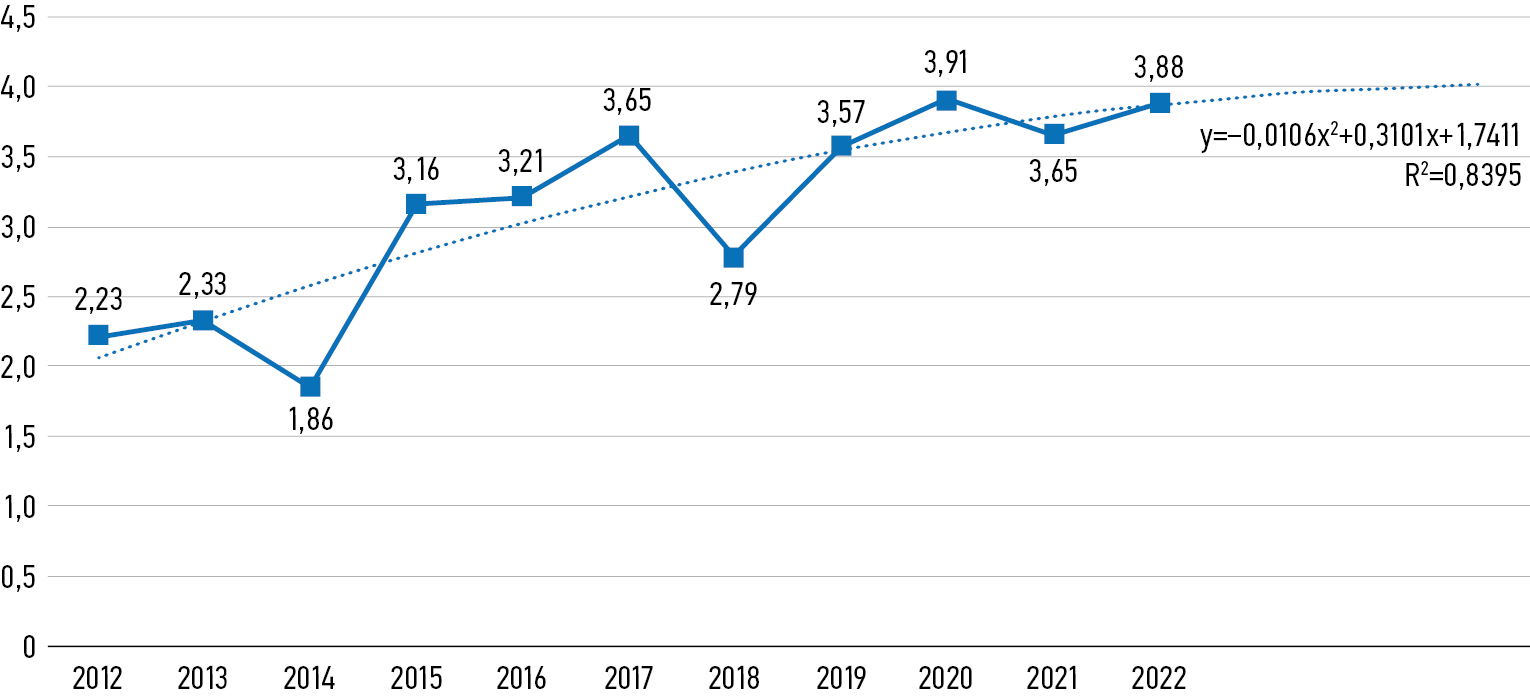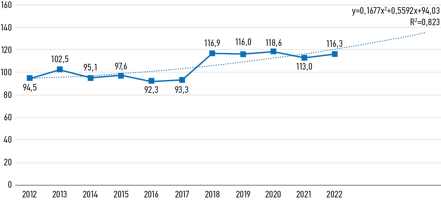 Fig. 4. Number of cases among children aged 15–17 years with ear and mastoid pathology in the Novosibirsk Region from 2012 to 2022 according to Federal State Statistics Service of the Russian Federation (total incidence per 1000 children of the corresponding age).