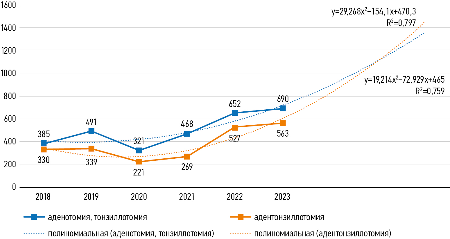 MATERIALS AND METHODS: A team of researchers from the Novosibirsk State Medical University together with the Novosibirsk City Children’s Clinical Emergency Hospital assessed the specialized otolaryngological care provided to the pediatric population from 2018 to 2023. The statistical data from the Federal State Statistics Service of the Novosibirsk Region were analyzed using a time series analysis, which includes trend lines, a regression analysis, and forecasting. The approximation coefficient indicates a high degree of accuracy in the study.