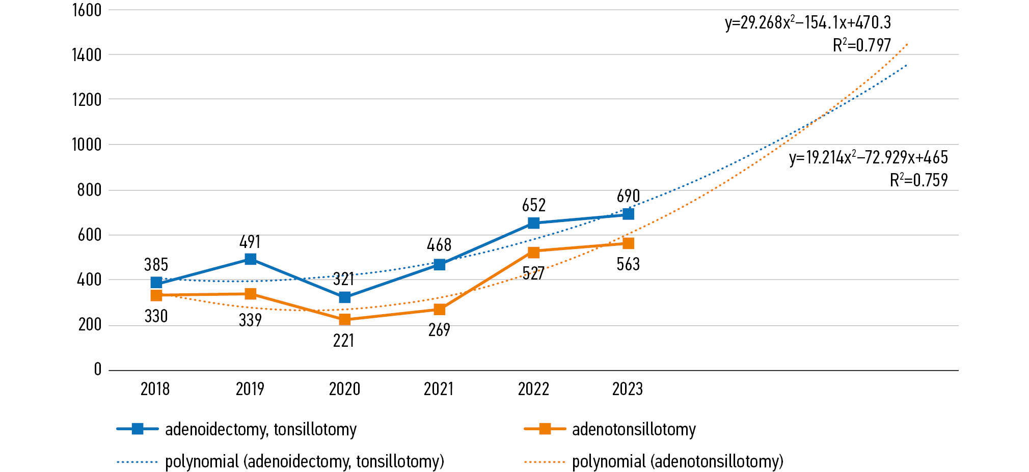An analysis of the number of children referred for inpatient surgical treatment in the ENT department between 2018 and 2023 showed a notable increase in surgical procedures involving the pharyngeal lymphoid ring. Specifically, the number of adenoidectomies and tonsillotomies increased by 79.2%, and the number of adenotonsillotomies rose by 70.6% (Fig. 7). These findings reflect the progression and decompensation of chronic otorhinolaryngologic conditions, necessitating surgical intervention even within an organ-preserving management strategy for this patient population. All ENT surgeries were performed strictly for clinical indications and established standards of medical care for the respective diagnostic categories. The trend line illustrates the pattern of these changes (see Fig. 7).