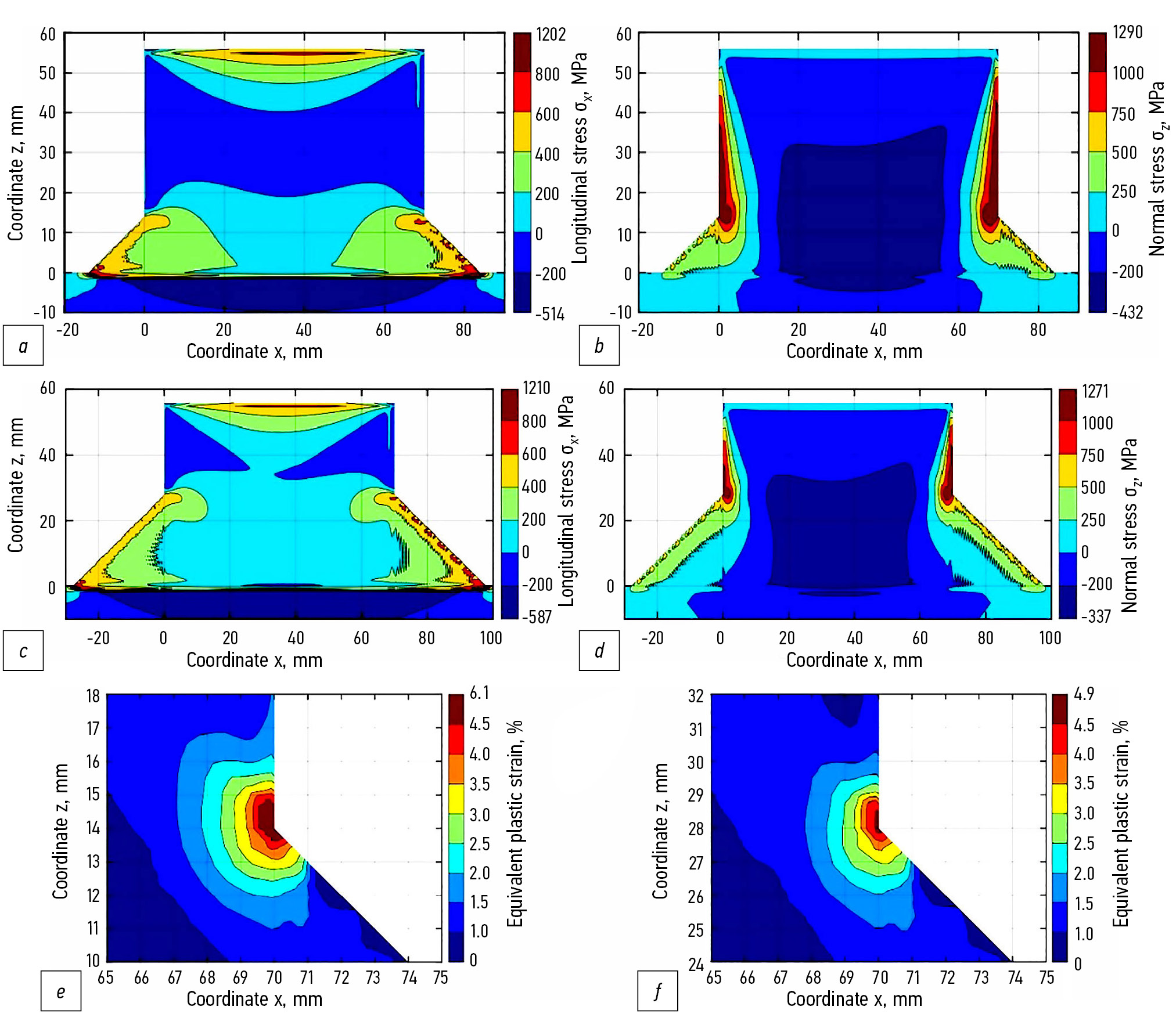 Рис. 4. Поля остаточных продольных (а, c) и нормальных (b, d) напряжений, накопленных пластических деформаций (e, f) в наплавке из сплава Ti-6Al-4V с плоскими галтелями катетом 14 мм (a, c, e) и 28 мм (b, d, f) на торцах.