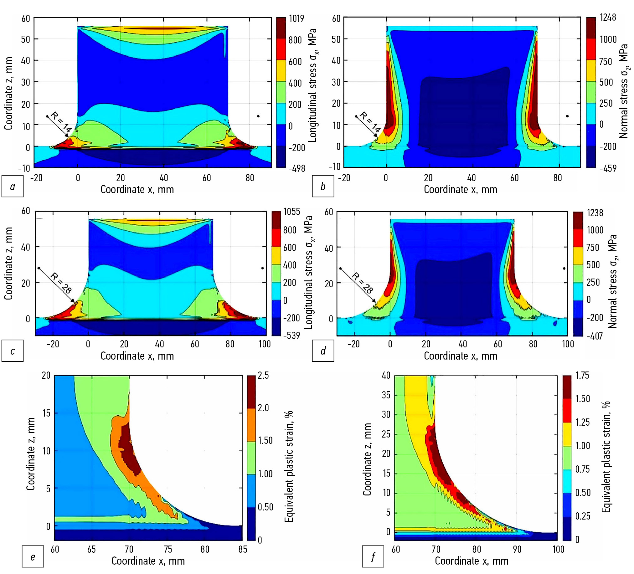 Fig. 5. Fields of residual longitudinal (а, c) and normal (b, d) stresses and accumulated plastic deformations (e, f) in a Ti-6Al-4V deposit with concave fillets with a radius of 14 mm (a, c, e) and 28 mm (b, d, f) at the ends.