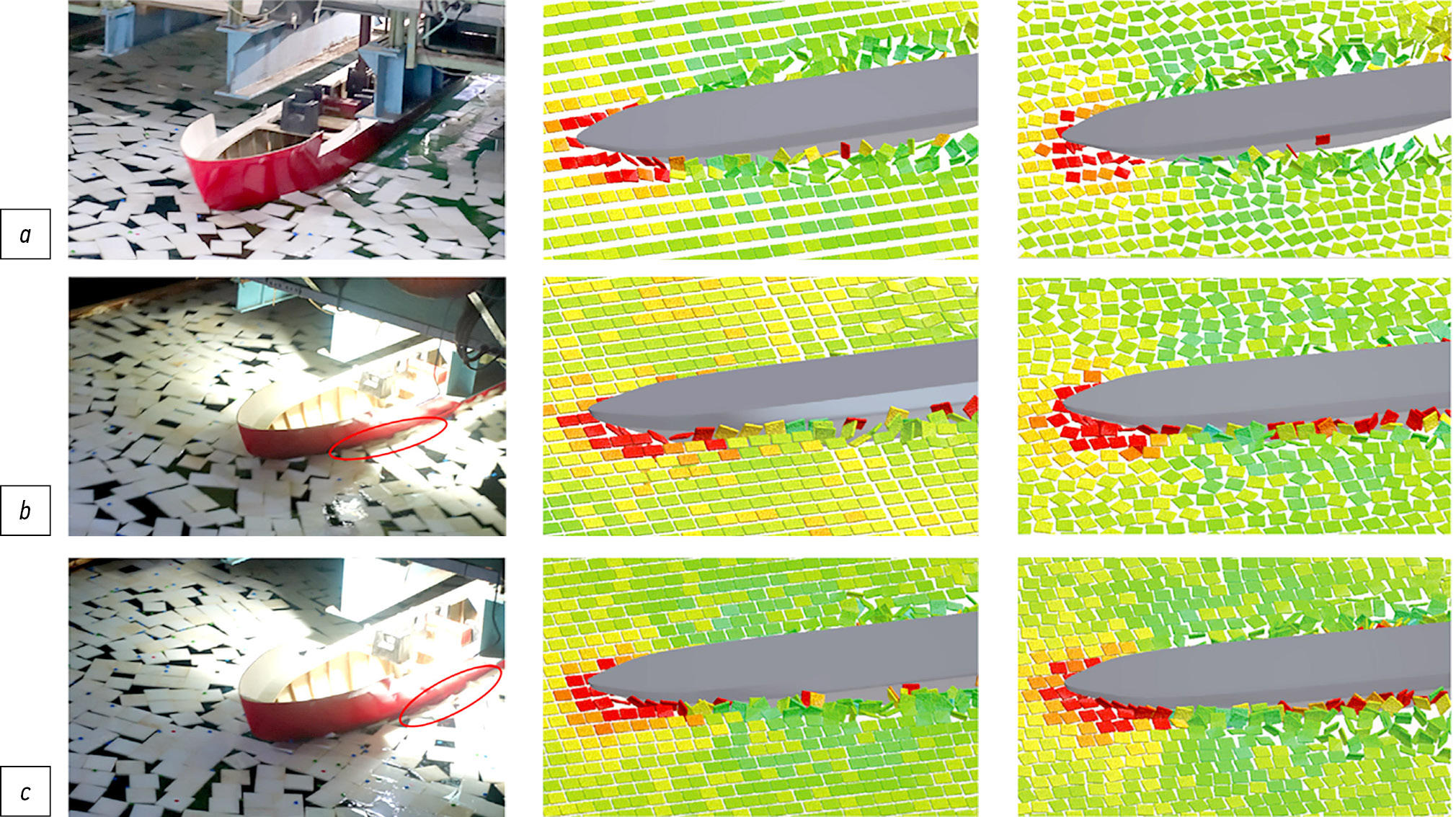 Fig. 5. Numerical ship model compared to a model experiment with different ice concentrations [9]: a, 60%; b, 80%; c, 90%.