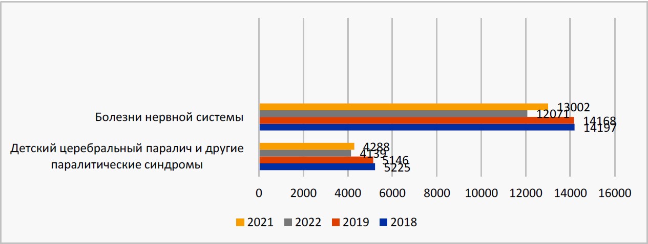Таким образом, дети-инвалиды, имеющие ДЦП и другие паралитические синдромы, занимали 1-е место среди заболеваний нервной системы. За период с 01.01.2019 по 01.01.2022 г. данный показатель увеличился с 85 101 до 87 576 и 88 212 детей, и темп роста за 3 года составил 3,7 %. Это можно объяснить тем, что с повышением качества оказания медицинских услуг (на этапе натального, интранатального и постнатального периодов), отмечается и рост числа детей с данной патологией.