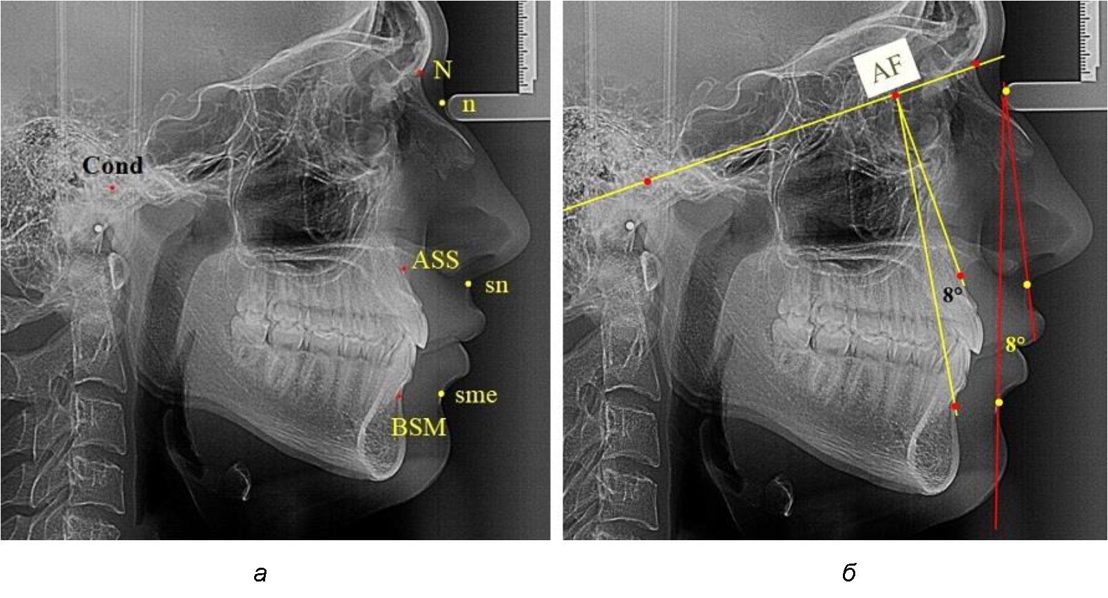 Рис. 2. Точечные ориентиры (а) и основные линии (б) профильного снимка лица для анализа параметров лицевого межгнатического угла
