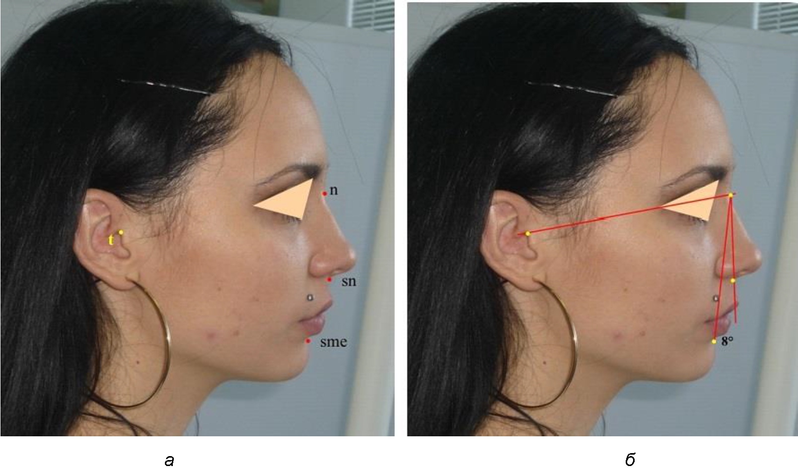 При фотостатическом анализе использовали профильные фотографии, на которых обозначали точки переднего профильного контура лица, позволяющие определить кожный лицевой межгнатический угол n–sn–smе, который, так же как и при телерентгенографичесом исследовании, обозначали как назально-супраментальный угол (рис. 2). Угол t–n–sn определял типологические варианты лица. Величина угла в 80° характерна для людей с нормопозицией верхней челюсти. Антепозиция верхней челюсти определялась увеличением угла, а ретропозиция – уменьшением. Данные типы лица также оказывали влияние на положение нижней челюсти. Величину угла нижней челюсти использовали в качестве типологической оценки ее роста.