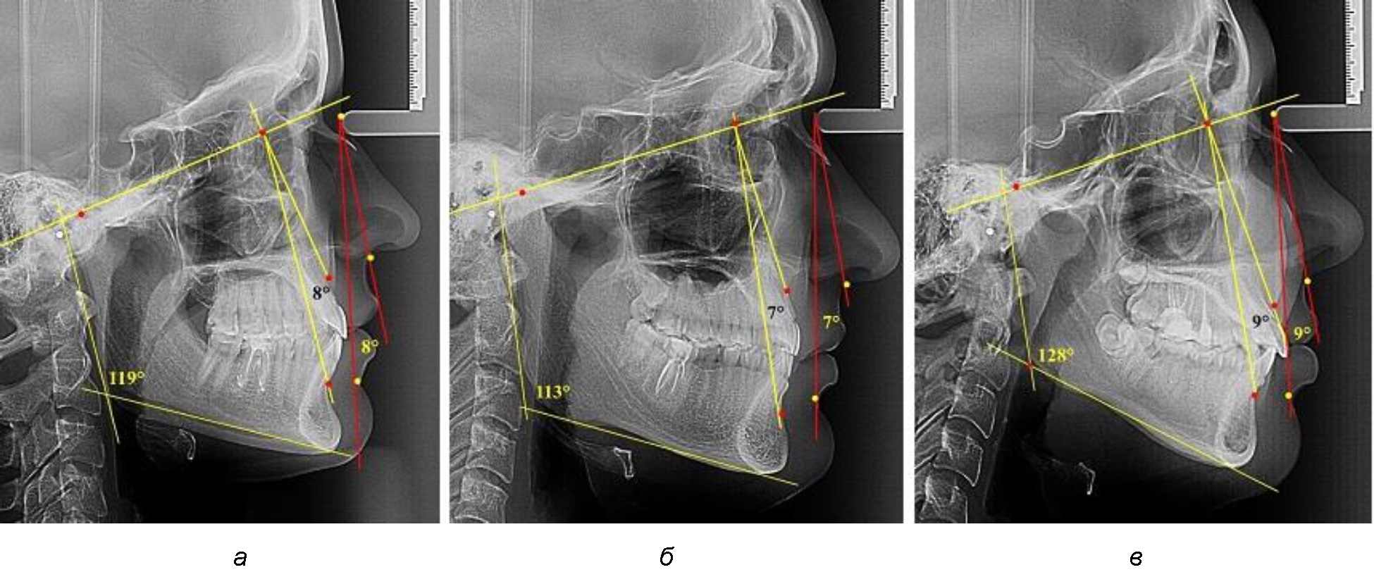 Рис. 4. Параметры лицевого межгнатического угла при нормопозиции (а), антепозиции (б) и ретропозиции (в) гнатического отдела лица