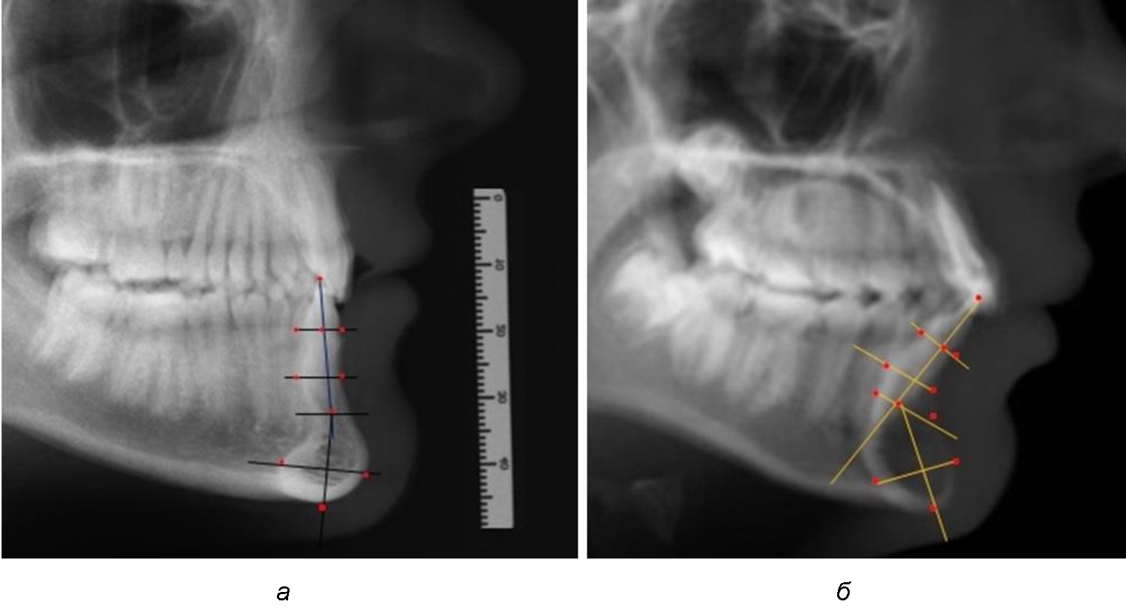 Рис. 5. Особенности нижнечелюстного резцового сегмента на ТРГ у людей при мезиальной (а) и дистальной (б) окклюзии