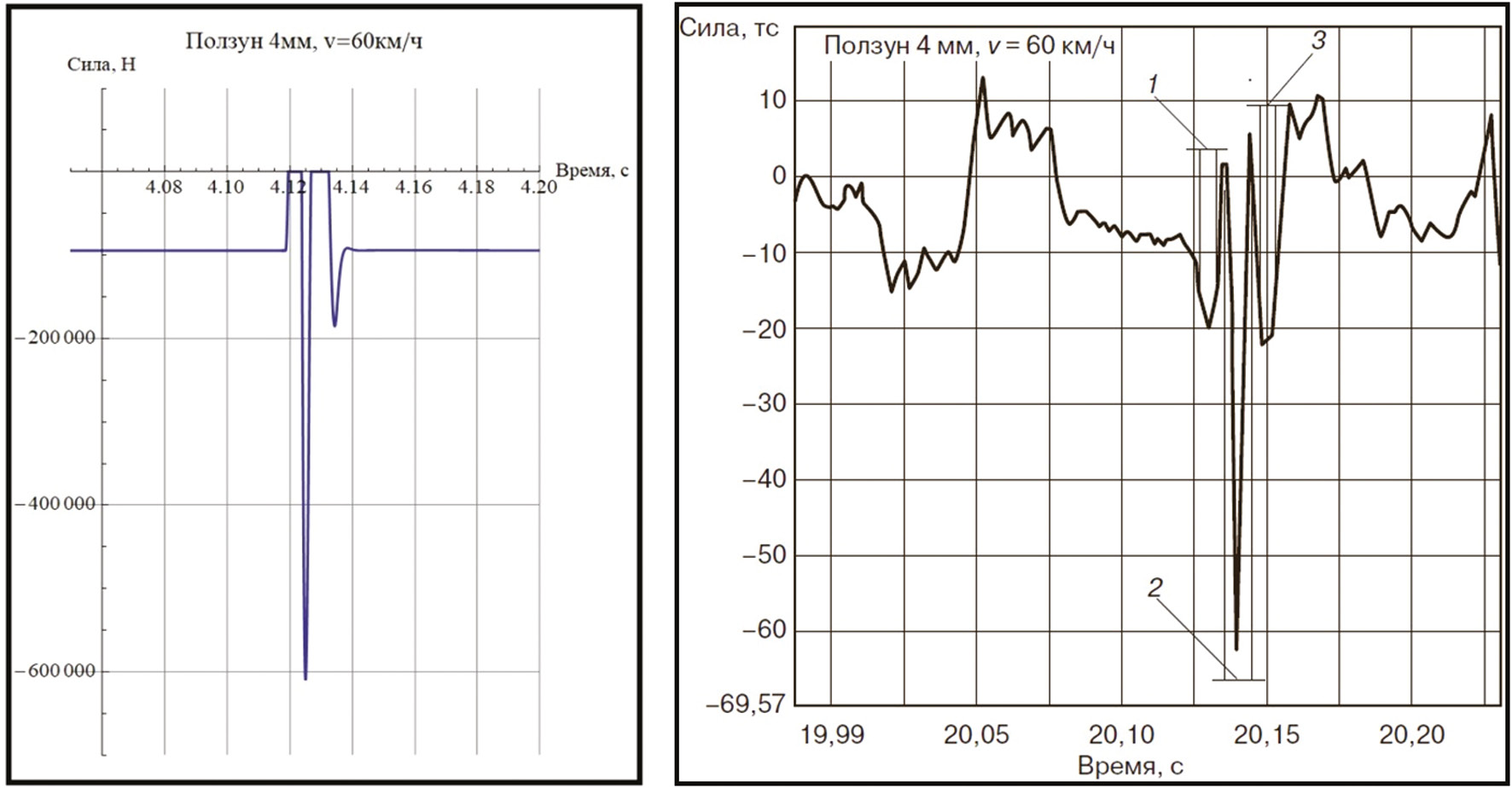 Выполнено сравнение полученного графика силы (рис. 2, а) с экспериментальными данными, полученными специалистами ВНИКТИ [2] (рис. 2, б), показавшее качественное и количественное сходство построенных графиков, наличие характерных фаз — разгрузки, удара и последействия.