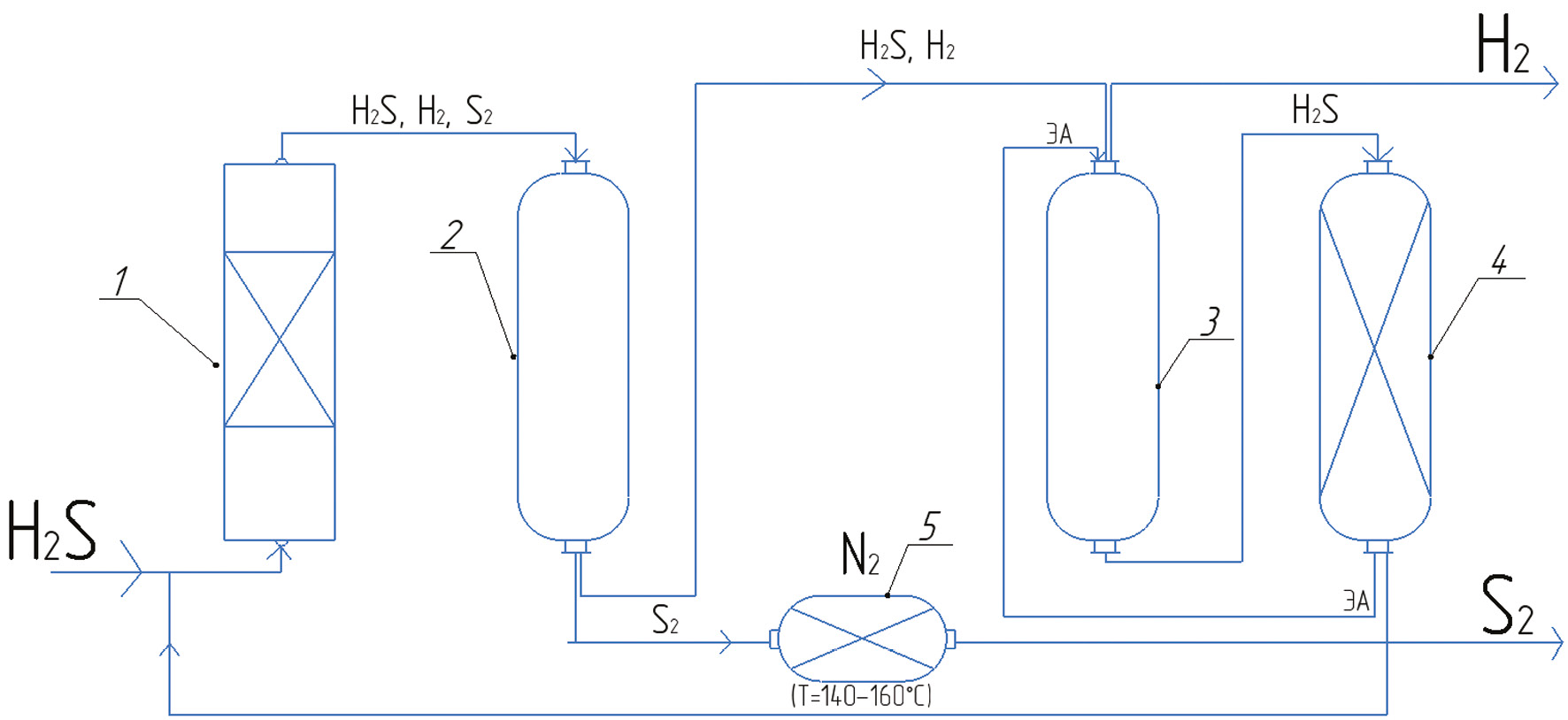 По формуле изобретения патента в программе «Компас» разработана принципиальная технологическая схема утилизации сероводорода с получением водорода и серы (рис. 1).
