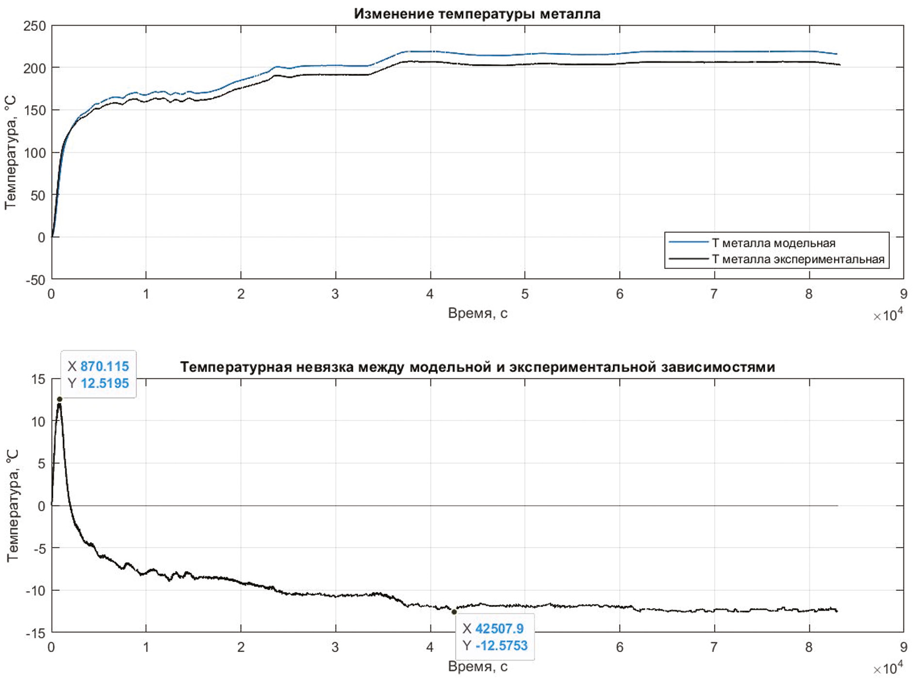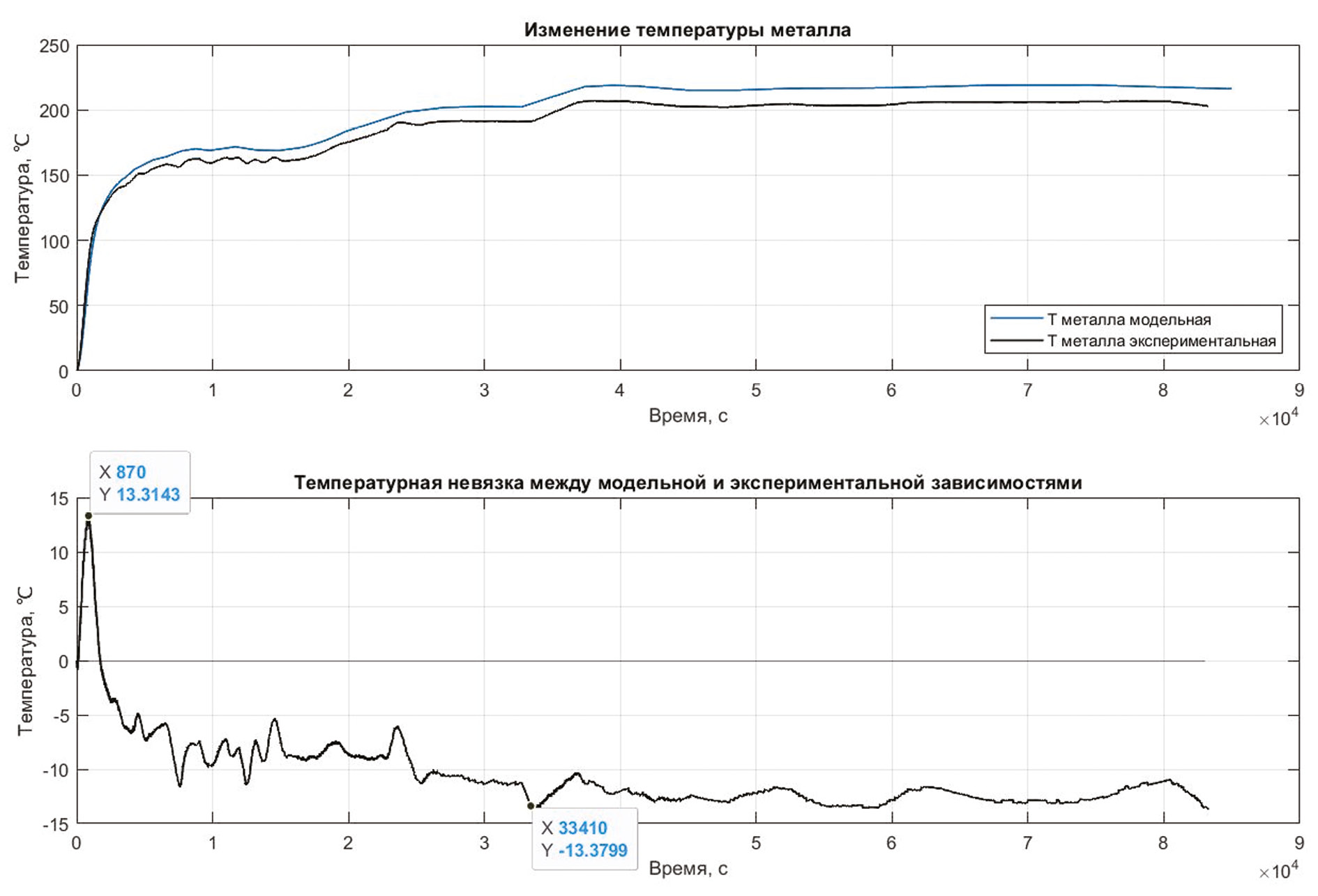 В результате идентификации был найден коэффициент конвективного теплообмена α = 620 Вт/(м2 · К), обеспечивающий выполнение условия альтернанса (рис. 1).