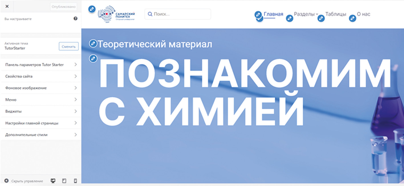 Информация, размещенная в электронном учебном пособии, дает возможность сориентироваться в образовательной среде, систематизировать полученные знания, повысить эффективность самостоятельной работы и оптимизировать образовательный процесс студентам среднего профессионального и высшего образования. В связи с этим был разработан сайт, созданный с целью упростить понимание химии и позволяющий повторить пройденный материал, для изучения которого также планируется использовать справочные материалы, практические задания, видеоматериалы, задания для самостоятельной работы и интерактивные таблицы и ссылки.