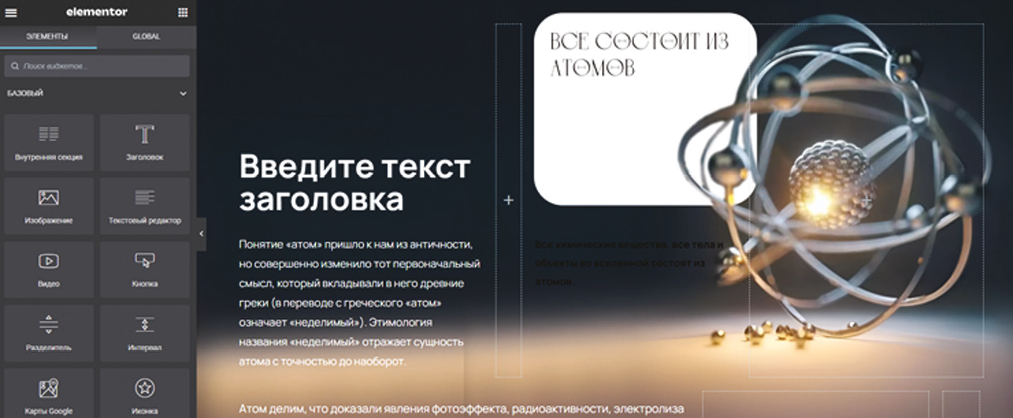 Рис. 2. Инструмент создания и редактирования страниц — плагин Elementor