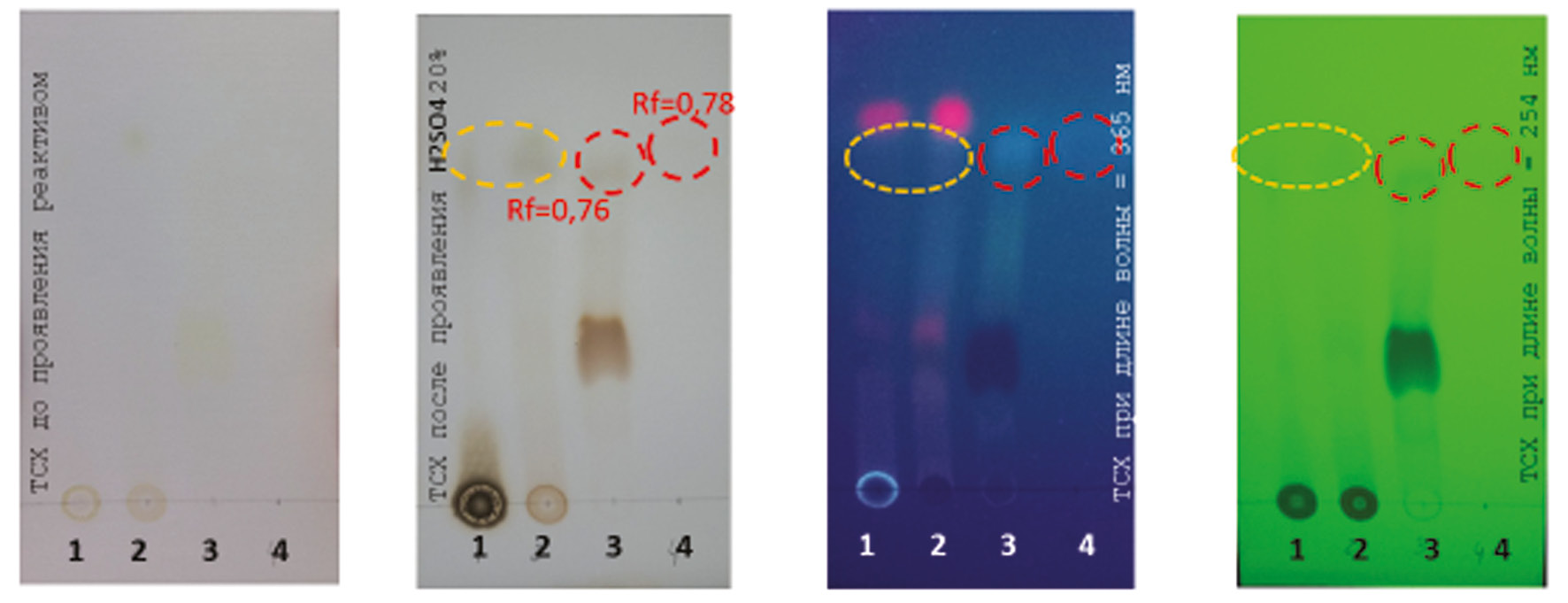 Предварительно проэкстрагировав активные компоненты сиропа при помощи ацетона [4], проводили анализ его содержимого с применением метода тонкослойной хроматографии (ТСХ) и ультрафиолетовой спектрофотометрии (УФ-спектрофотометрии).