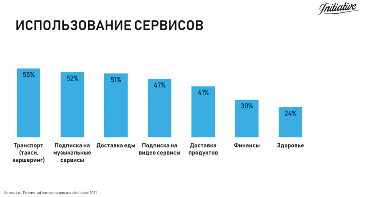 Методы. Если обратиться к рис. 1, то можно увидеть список самых популярных сервисов среди людей, живущих в России, при этом из года в год этот список растет все больше и больше. Сегодня в Интернете можно не только заказывать себе вещи, еду, но и получать образование, обращаться за помощью к врачу, нанимать работников или заказывать различные виды услуг. Все это является только малой частью того, что можно делать в Интернете. По данным опросов (рис. 1), проведенных компанией Initiative, можно выделить топ-3 самых популярных онлайн-сервисов России — транспорт, музыкальные сервисы, доставка еды, где популярность среди пользователей более 50 %.
