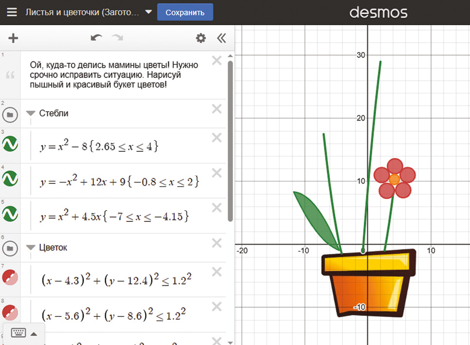 - «Числовые неравенства» и «Функционально-графический метод решения неравенств». Первый тип заданий данного раздела подразумевает под собой демонстрацию изображения или части изображения, выполненного с помощью линейных или квадратичных неравенств (рис. 2). Обучающимся предлагается сделать такой же рисунок самостоятельно и достроить данное изображение: добавить «цветочки» и «листочки», используя кусочные функции.