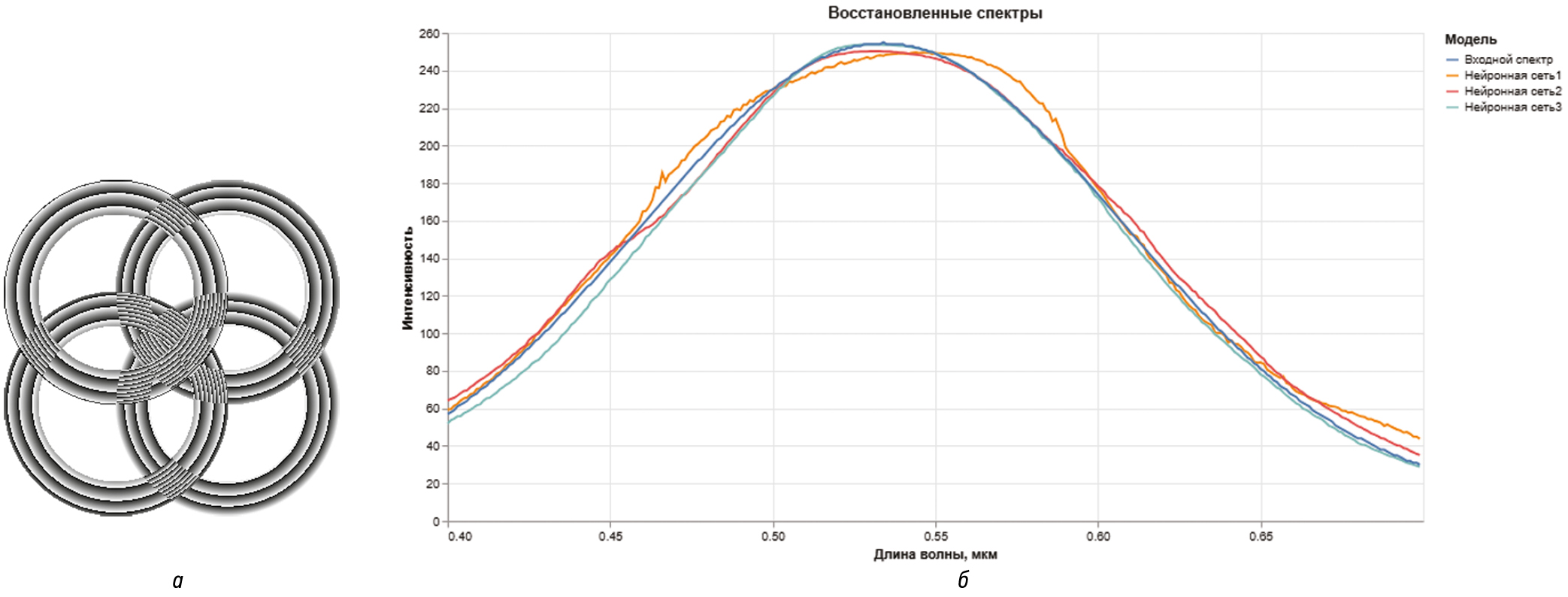 2. Рис. 1. Схематичный вид фазовой функции матричного гиперспектрометра 2×2 (а), восстановленные нейронными сетями и исходный спектры (б)